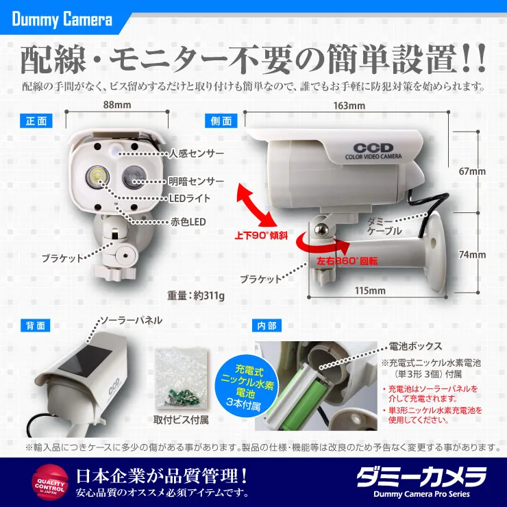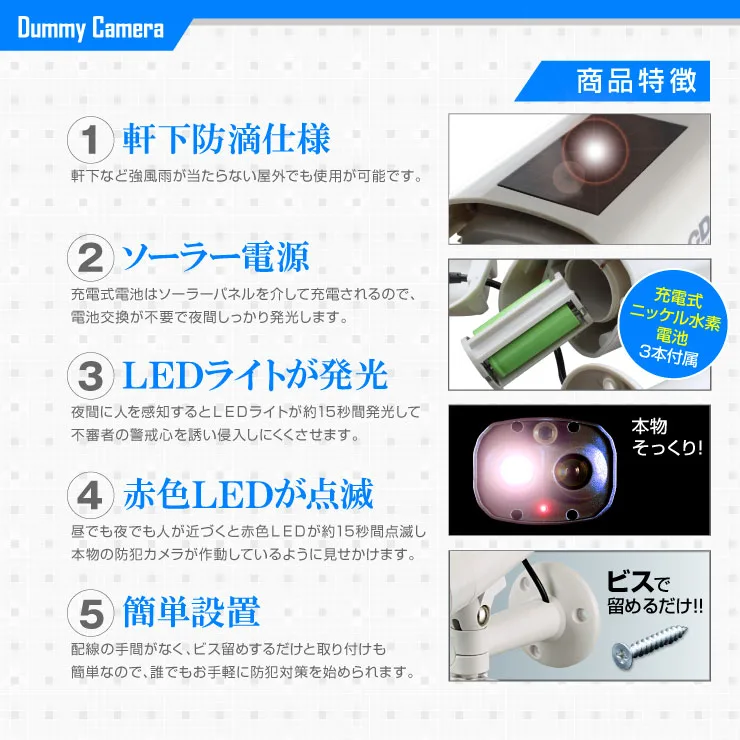 | 【セット内容】 | 1.ダミーカメラ本体 2.ネジ×3本 3.アンカー×3本 4.単3形充電池×3本 5.日本語取扱説明書 6.保証書 |
