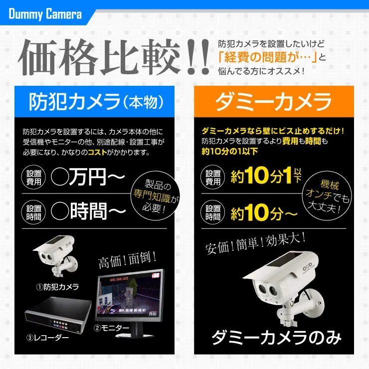 不審者・空き巣・万引きなどの防犯対策に! ローコストで防犯対策!狙わせない高い威嚇力! ☆☆☆☆☆☆☆☆☆☆☆☆☆☆☆☆☆☆☆☆☆☆☆☆☆☆☆☆ 日本の企業が品質管理!信頼の安心品質! シリーズ最強の高機能モデル登場!ダブルセンサー&ダブルLED発光の本格派モデル! ソーラーパネル付(充電式)の防犯ダミーカメラ!長期間電池交換不要の安心設計! ◎住まいや駐車場・お店などに設置することで手軽に防犯対策! ◎本格暗視タイプデザインのケースを採用でプロでも判別困難!本物そっくりな外観で不審者を威圧! ◎夜間は人が近づくと自動でLEDライトが約15秒間発光し不審者を威嚇します。 ◎昼夜関係なく人が近づくと赤色LEDが約15秒間点滅し防犯カメラが作動しているようにみせかけます。 ◎配線の手間がなくネジ留めするだけの簡単設置でお手軽防犯対策! ●人感センサー搭載で暗闇でも人を感知して自動で高輝度LEDライトが強力発光! ●明暗センサー搭載で夜間だけ発光!赤色LEDは昼夜関係なく人が近づくと点滅! ●センサーとLEDライトはソーラー電源で作動するため長期間電池交換が不要です。 ●付属の充電池(単3形3個)は、ソーラーパネルを介して充電されるので夜間も発光します。 ●防滴構造になっているので軒下など強風雨が当たらない屋外でも使用が可能です。 ●防犯カメラを設置するよりコストおよび設置時間ともに約10分の1以下でできます。 ●本物の防犯カメラや防犯ステッカー、防犯プレートと組み合わせて設置すると更に効果的です。 ※本製品は本物の防犯カメラに似せたダミー商品です。カメラとしての撮影機能はありません。 |