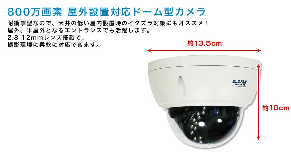 - 撮影範囲調整可能 800万画素 耐衝撃 ドーム型防犯カメラ 防雨 800D-VR